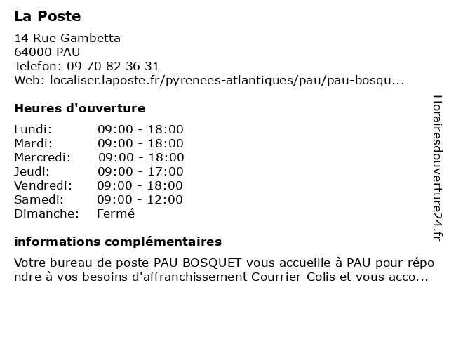 Horaires d ouverture de bureau de poste pau bosquet 14 rue gambetta 64000 pau les cookies assurent le bon fonctionnement de nos services. Ouvert de 8 h 30 à 18 heures. Découvrez également tous les services proposés par la poste.